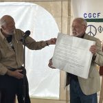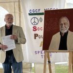 - Rob Shetterly, artist and originator of the Americans Who Tell the Truth project, spoke about his portrait paintings (now #270) of Americans who stand up for truth, justice and democracy. Rob unveiled his new portrait of Doug Rawlings, Veterans for Peace founder, who shared his experience of being drafted, serving in Viet Nam and working for a sustainable peace.