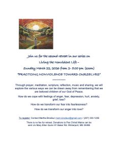 Please join us for the second retreat in our series on Living the Nonviolent Life, inspired by Fr. John Dear’s book. This retreat will focus on “Practicing Nonviolence Toward Ourselves”.